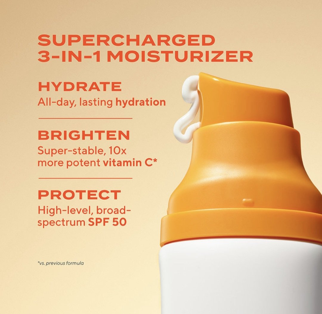 This 3-in-1 multitasking moisturizer delivers all-day,glowy hydration supercharged with 10x more Vitamin C plus high SPF 50 sun protection to visibly brighten after 1 use.